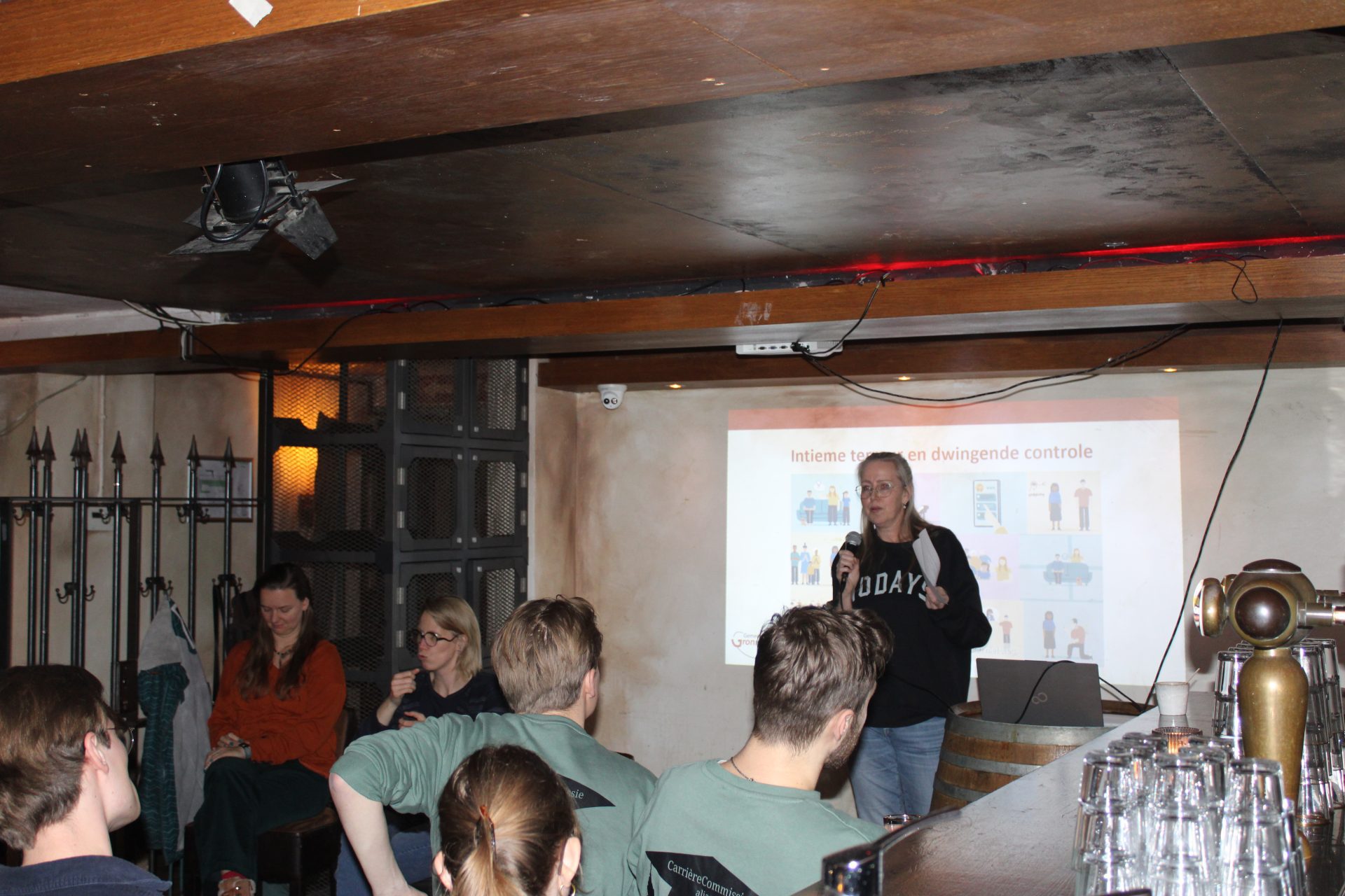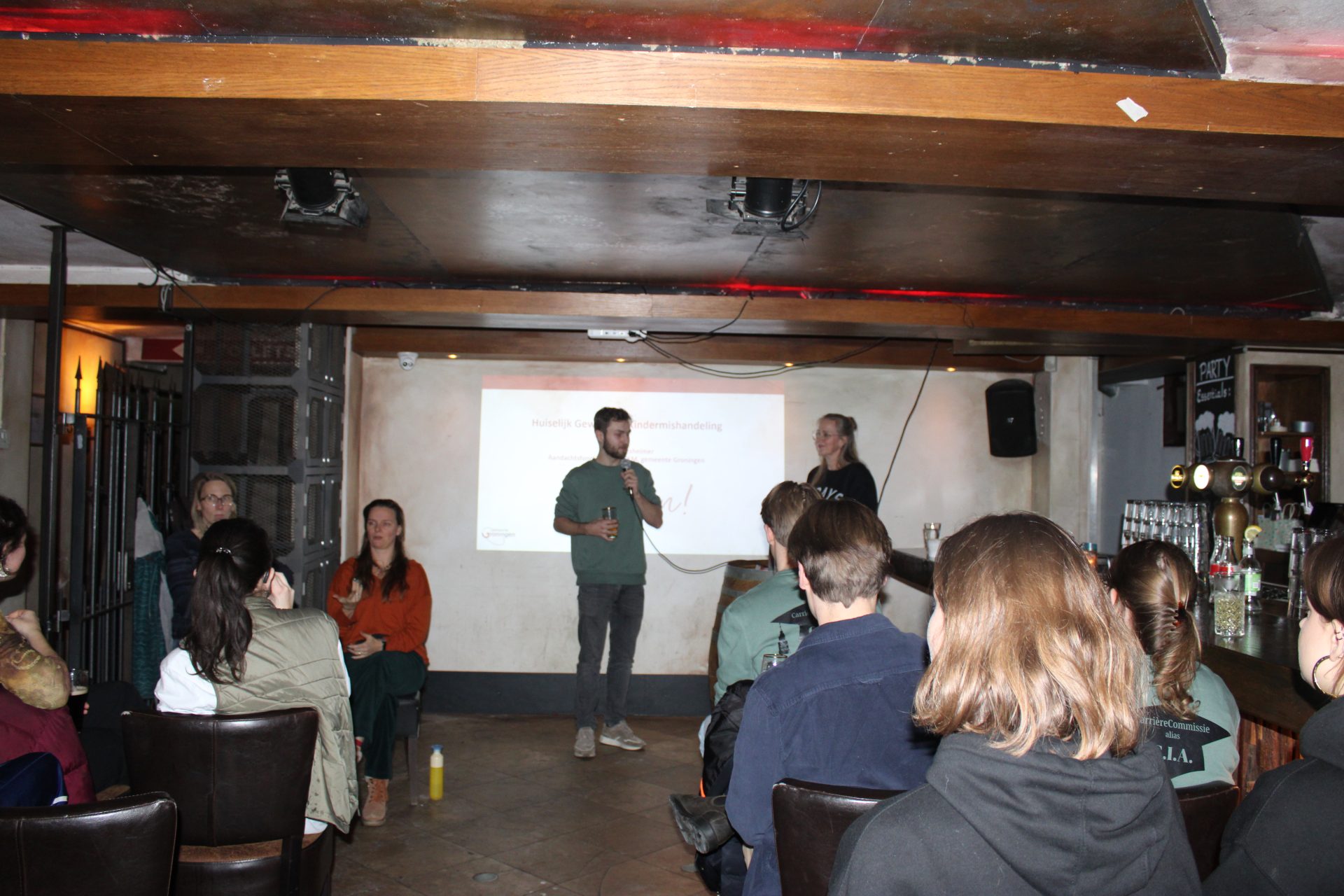 Op dinsdag 16 december organiseerde de C.I.A. een Kroegcollege bij The Dog’s Bollocks. Het Kroegcollege werd gegeven door een aandachtsfunctionaris bij de gemeente Groningen over het onderwerp huiselijk geweld en kindermishandeling. Tijdens de lezing werden begrippen als ‘intieme terreur’ en ‘dwingende controle’ toegelicht door middel van een casus waarmee de spreker zelf had gewerkt. Het was een interessante en ook ingrijpende lezing. Wij willen graag de C.I.A. bedanken voor het organiseren van het Kroegcollege.