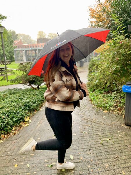 Een zwart-rode paraplu die met één druk op de knop uitklapt en waardoor Sociëtas zich ontvouwt.